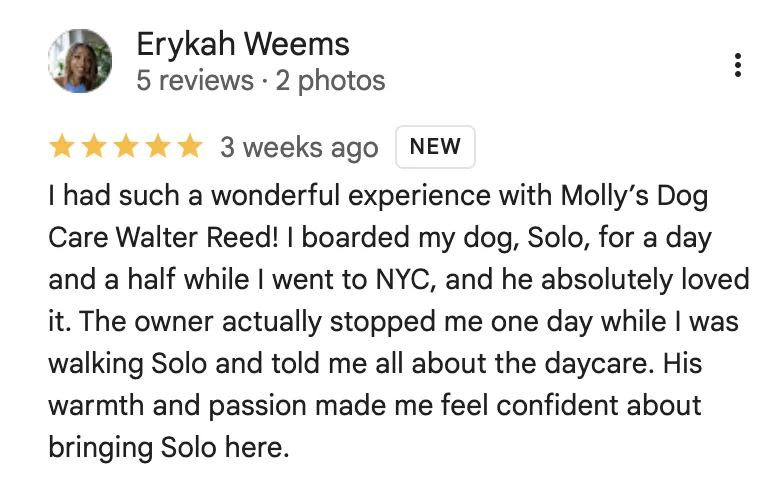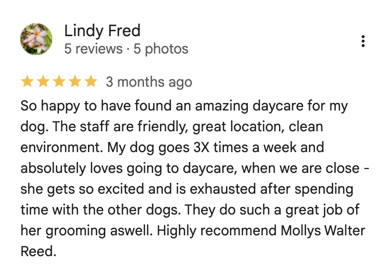 Welcome to Molly’s Dog Care Walter Reed, where tails wag and paws play in a safe, modern, and caring environment. From daycare and boarding to full-service grooming, our team is dedicated to keeping your pup happy, healthy, and loved. With top-of-the-line facilities and trained staff, we make every visit feel like a treat for both you and your furry friend.